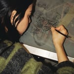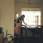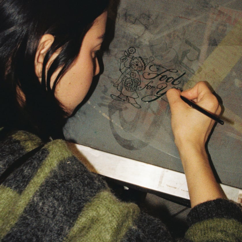 Black design printed in-house on vintage pink t-shirt.