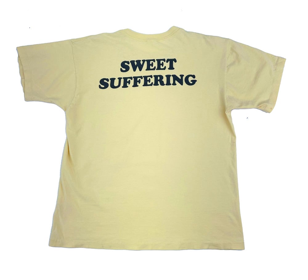 Vintage washed yellow tshirt with unique snap button pocket detail. Screen printed in black back graphic.
